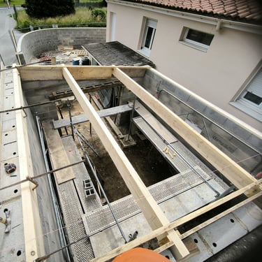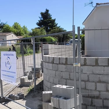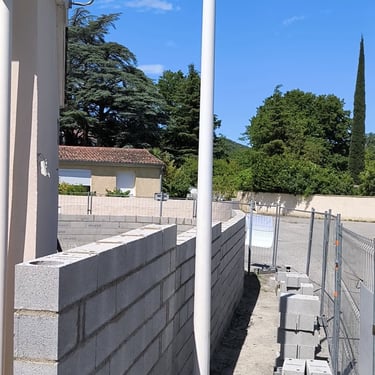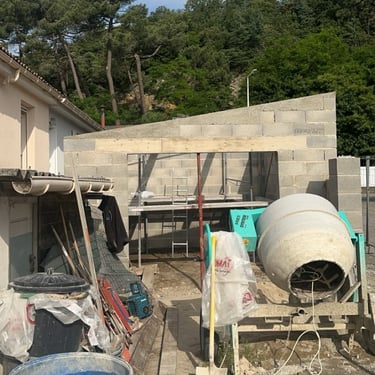 Chantier création d'un garage en bloc parpaing avec un linteau en béton.